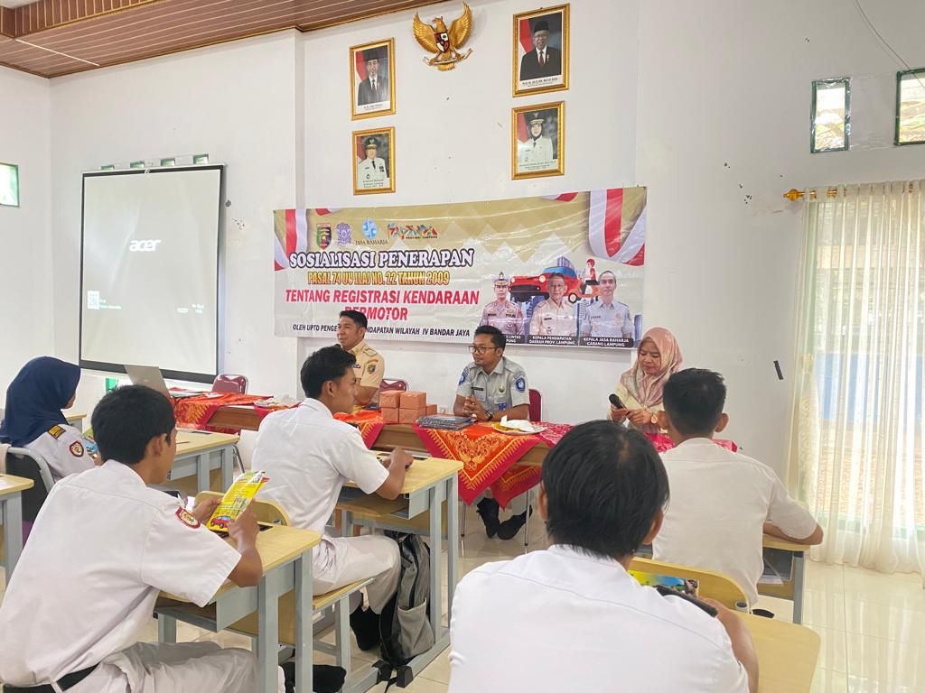 Kegiatan yang dilaksanakan di Aula SMKN 2 Terbanggi Besar, Lampung Tengah ini dihadiri oleh Drs Evan Hendrawan KA UPTD Pendapatan Lampung Tengah dan Petugas Jasa Raharja Lampung Tengah Trio Effendi.