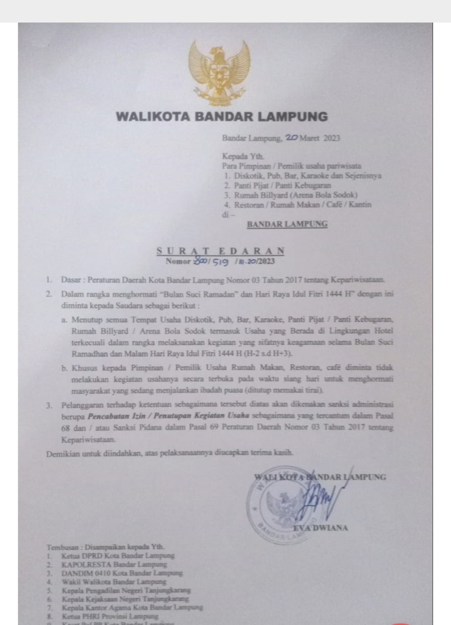 Dimana dalam rangka menghormati bulan suci ramadan dan hari raya Idul Fitri 1444 H. Maka diminta pada semua pemilik usaha Diskotik, Pub, Bar, Karaoke, Panti Pijat / Panti Kebugaran, Rumah Billyard / Arena Bola Sodok termasuk Usaha yang Berada di Lingkungan Hotel untuk ditutup selama ramadhan.