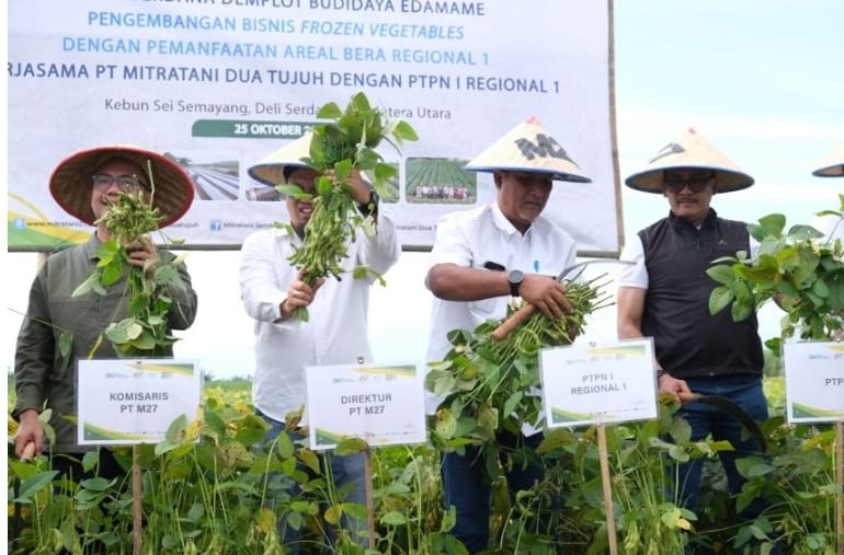 Dalam sambutannya, Direktur PT Mitratani Dua Tujuh l Tumbas Ginting bersama Jajaran menyampaikan kepuasannya yang ternyata lahan wilayah Sumatera Utara khususnya areal PTPN I Regional 1 yang merupakan anak usaha PTPN III (Persero) memiliki Potensi Besar untuk pengembangan Edamame yang baru dilakukan Tanam percobaan Perdananya di bulan Agustus 2024 lalu seluas 4 Hektar dapat dipanen dalam kurun waktu lebih kurang 2 bulan.