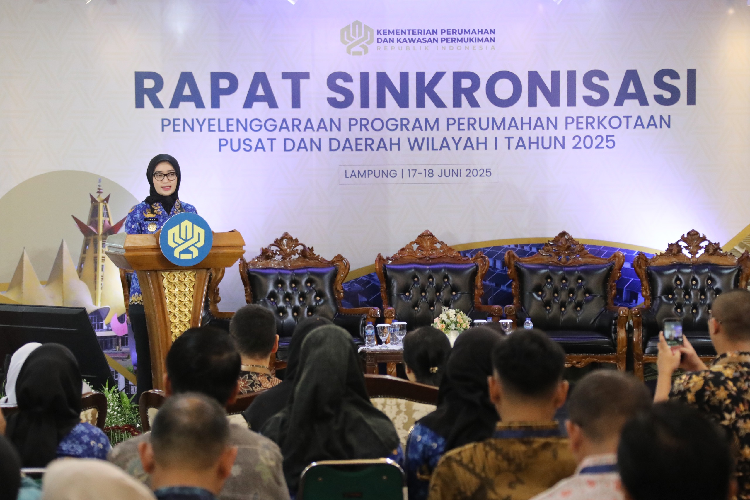 BANDARLAMPUNG Suara Kota —– Wakil Gubernur Lampung Jihan Nurlela menghadiri Rapat Sinkronisasi Penyelenggaraan Program Perumahan Perkotaan Pusat dan Daerah Wilayah I Tahun 2025, di Ruang Abung, Balai Keratun, Komplek Kantor Gubernur Lampung, Selasa (17/6/2025).