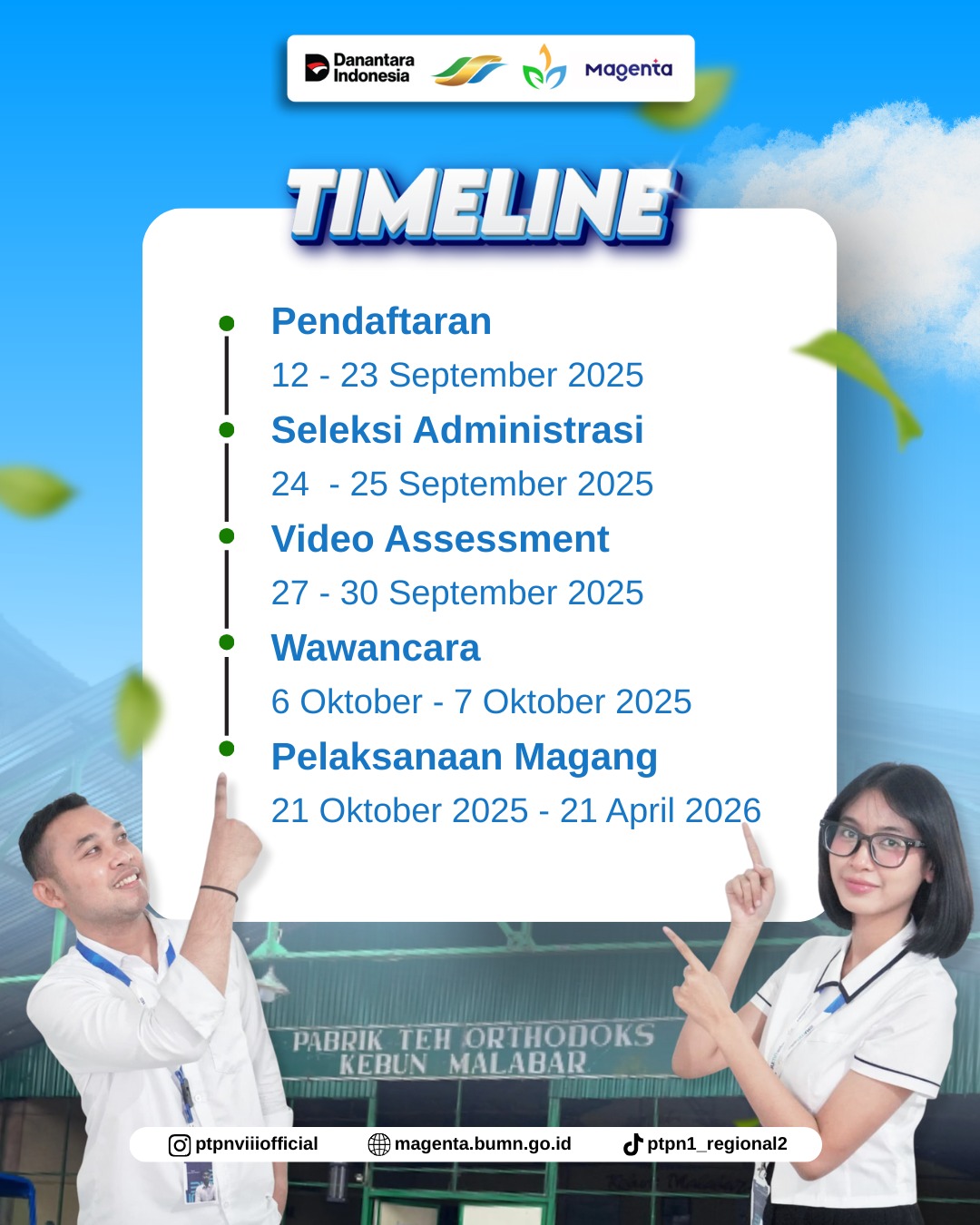 JAKARTA Suara Kota — Melalui Magenta, Program Magang Terpadu Kementerian BUMN, PTPN I Regional 2 yang berpusat di Bandung membuka 15 formasi untuk para mahasiswa. Para mahasiswa yang akan diterima minimal sudah menjalabi studi lima semester dengan predikat aktif, baik dari program D-3, S-1, maupun D-4. Formasi ini bisa dilihat di laman https://magenta.bumn.go.id/c/ptpn-viii dengan batas akhir 23 September 2025 untuk penempatan wilayah kerja PTPN I Regional 2 Bandung.